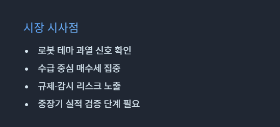 즉, 최근 로봇 테마 강세 속에서 매수세가 과열되는 흐름이 확인되었고, 이에 따른 시장 리스크 관리 차원의 조치가 시행된 셈이다.