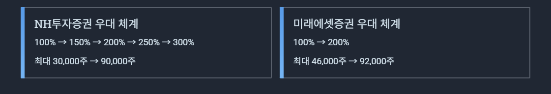 두 증권사 모두 우대청약자 그룹이 존재하며, 균등·비례 방식에서 우대 체계가 영향을 줄 수 있습니다.