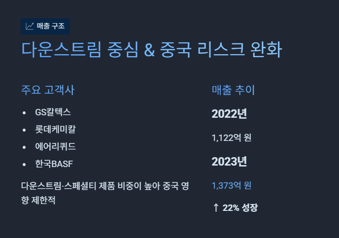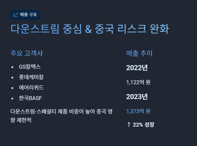 고객 매출 구조 — 다운스트림 중심 + 중국 리스크 완화