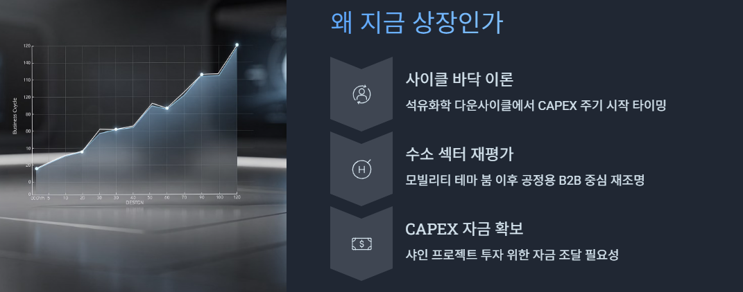 실적·산업·수익 모델은 탄탄하지만, 반대로 석유화학 경기와 수소업 심리가 변수로 작용할 수 있는 상장 케이스입니다.