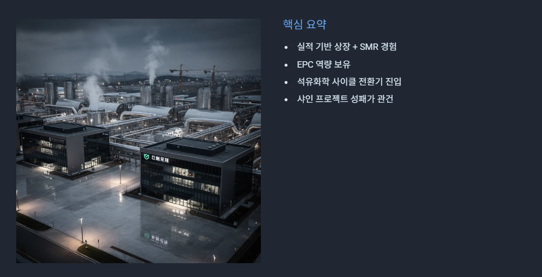 - 수소 테마 중 실적 기반 상장 + SMR 경험 + EPC 역량