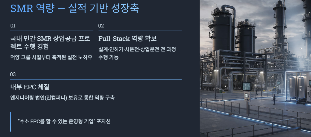 덕양이 단순 정제기업이 아니라 시장에서 주목받는 이유는 SMR 생산 + EPC 능력 때문이다.