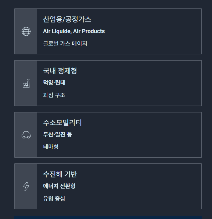 | 산업용/공정가스 | Air Liquide, Air Products | 글로벌 가스 메이저 |