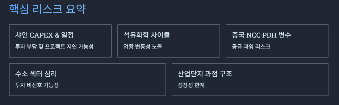 - CAPEX 부담 + 초기 가동률 + 샤인 일정 지연 가능성