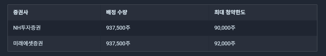 | 증권사 | 배정수량 | 개인청약한도 | 비고 |