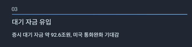미국 통화 완화 기대와 역대 최고 수준 증시 대기 자금(약 92조 6천억)으로 인해, 단기 과열 가능성도 존재합니다.