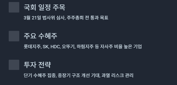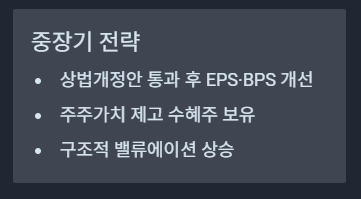 - 중장기: 상법개정안 통과 시 EPS·BPS 구조 개선, 주주가치 제고