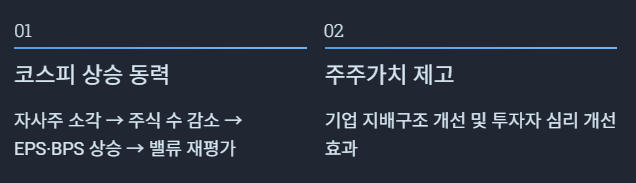 자사주 소각 의무화는 주식 수 감소 → EPS·BPS 상승 → 밸류 재평가로 이어져 코스피 상승 동력을 제공합니다.