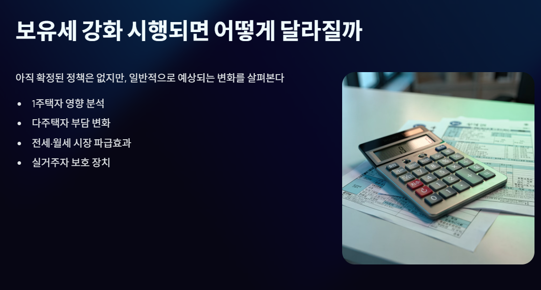아직 확정된 정책은 없지만, 일반적으로 보유세 강화가 이루어질 경우 예상되는 변화는 다음과 같다.