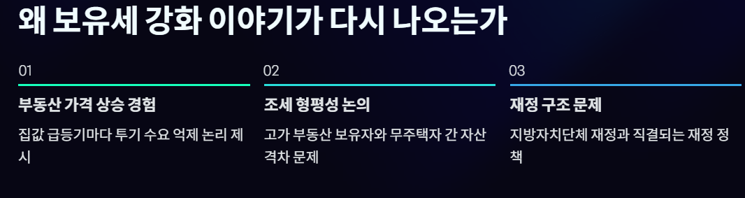 보유세 강화 논의가 반복적으로 등장하는 데에는 몇 가지 공통된 배경이 있다.
