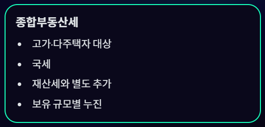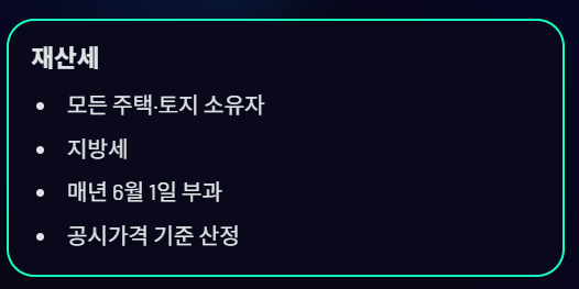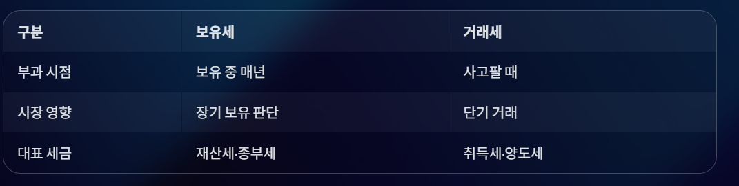 | 대표 세금 | 재산세·종부세 | 취득세·양도세 |