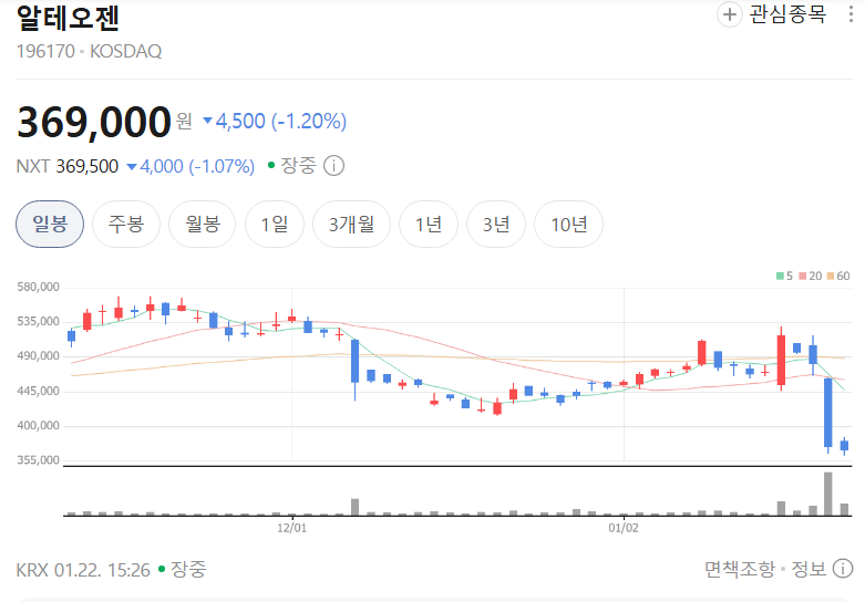 알테오젠 자체 이슈와 더불어, 바이오 섹터 전반의 투자 환경 변화, 그리고 고평가 논란에 따른 차익 실현 압력이 동시에 작용한 결과로 보는 시각이 우세하다.