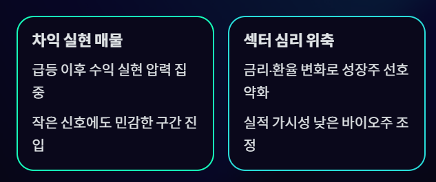 차익 실현 + 바이오 섹터 조정 + 기대치 재점검이 복합적으로 작용한 결과로 해석된다.