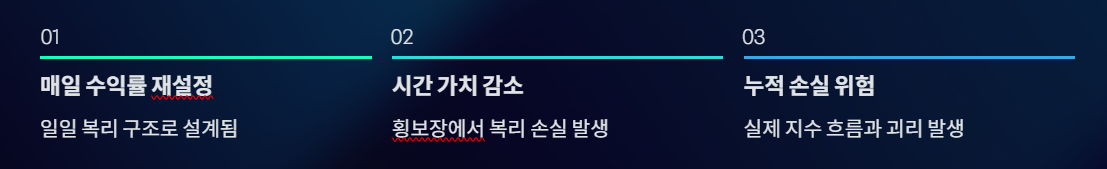 - 실제 지수 흐름과 다르게 ==> 시간 가치 감소(복리 손실)가 발생한다.