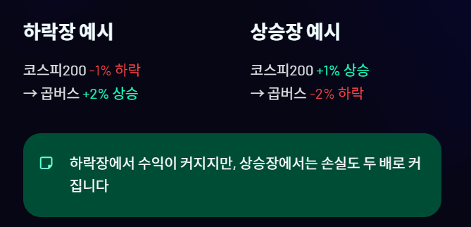 - 지수 +1% 상승 → 인버스 -1% 하락