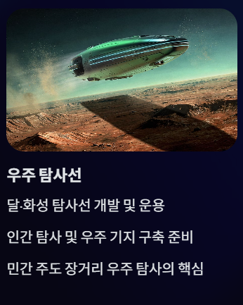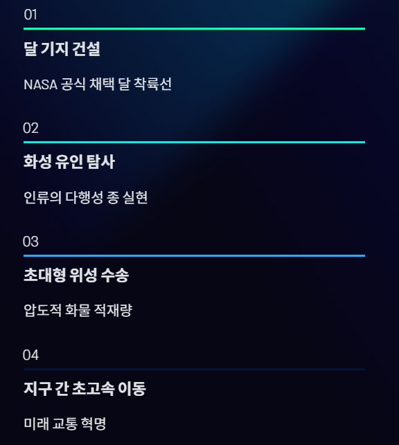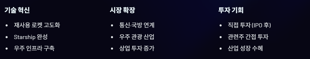 - 장기적으로 달·화성 탐사선, 우주 기지 구축 등 우주 상업화의 핵심 축