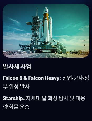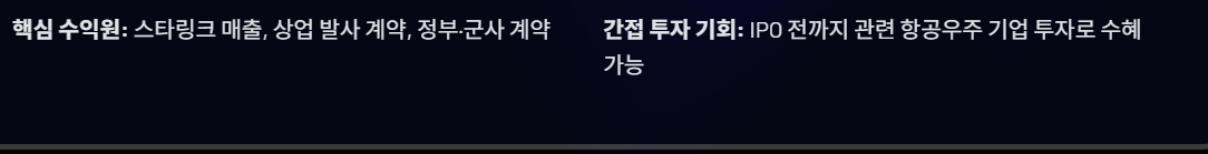 - 핵심 수익원: 스타링크 매출, 상업 발사체 계약, 정부/군사 계약