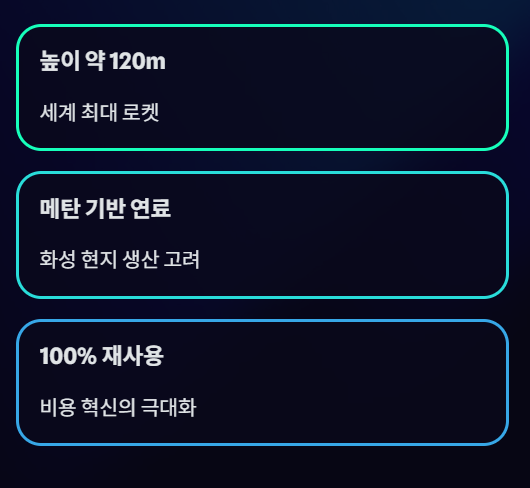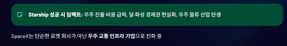 - Starship: 장기적으로 달·화성 탐사 및 대용량 화물 발사 가능