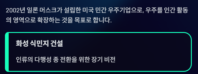SpaceX는 2002년 일론 머스크가 설립한 미국 민간 우주기업입니다.