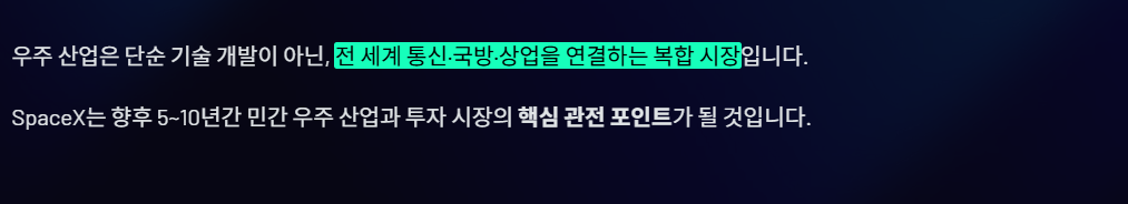 머스크의 비전은 단순히 기술 개발을 넘어 우주 산업을 새로운 투자·경제 모델로 만들고 있다는 점에서 큰 주목을 받습니다.