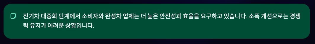특히 전기차 시장이 본격 대중화 단계로 접어들면서, 소비자와 완성차 업체는 더 높은 안전성과 효율을 요구하고 있다. 단순한 소폭 개선으로는 경쟁력을 유지하기 어려운 상황이다.