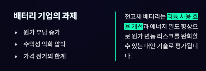 리튬 가격 변동성, 기존 배터리 기술의 한계, 글로벌 경쟁 환경 속에서