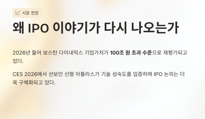보스턴 다이내믹스의 IPO 가능성은 단순 루머가 아니라 시장 재평가와 기술 성숙도가 반영된 흐름이다.