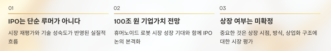 100조 원 이상의 기업가치 및 휴머노이드 로봇 시장 성장 기대가 함께 제기되며 IPO 논의가 본격화하고 있다.