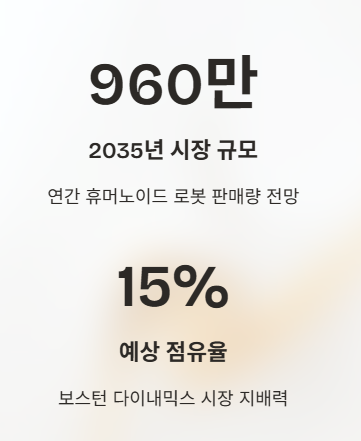 증권사들은 2035년 휴머노이드 로봇 시장이 연간 약 960만 대 규모로 성장할 것으로 전망하며, 보스턴 다이내믹스가 그중 15% 이상을 점유할 수 있다는 분석도 제시한다.