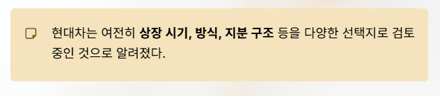 다만 IPO가 반드시 실행된다는 것은 아니다. 현대차는 여전히 상장 시기, 방식, 지분 구조 등을 다양한 선택지로 검토 중인 것으로 알려졌다.