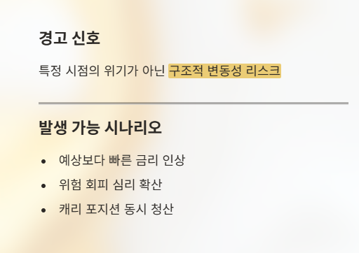 엔 캐리 트레이드가 급격히 청산될 경우 발생할 수 있는 변동성 리스크를 경고하는 개념에 가깝다.