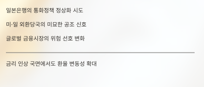 특히 엔화 금리가 인상되는 국면에서도 환율 변동성이 확대되는 현상은 기존의 통념과 어긋나는 움직임으로, 개인 투자자 입장에서도 주의 깊게 살펴볼 필요가 있다.