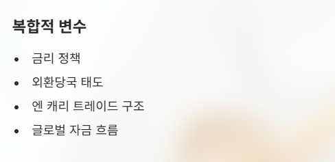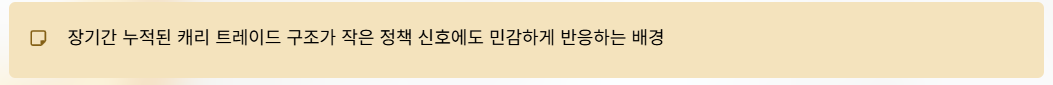 그래서 엔 캐리 트레이드는 위기 상황에서 엔화 환율을 급변시키는 핵심 요인으로 작용한다. 최근 엔화 환율이 작은 정책 신호에도 민감하게 반응하는 배경에는, 이처럼 장기간 누적된 캐리 트레이드 구조가 자리 잡고 있다.