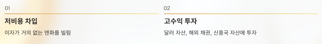 일본의 초저금리 환경에서는 엔화를 빌리는 비용이 매우 낮았기 때문에, 글로벌 투자자들은 엔화를 차입해 달러 자산, 해외 채권, 주식, 신흥국 자산 등에 투자하며 금리 차이에서 수익을 얻어왔다.