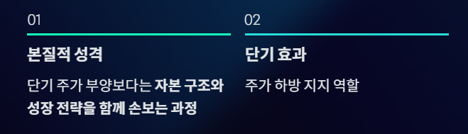 즉 단기 주가를 끌어올리기보다는 주당 가치 구조를 바꾸는 데 목적이 있다고 볼 수 있다.