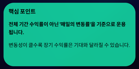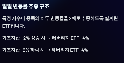 - 기초자산이 하루 +2% 상승 → 레버리지 ETF +4%