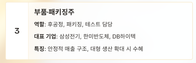 - 부품주: 패키징, 테스트 등 후공정 담당