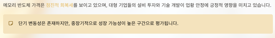 삼성전자와 SK하이닉스 등 대형 기업의 설비 투자 및 기술 개발 계획이 업황 안정에 긍정적 영향을 미치고 있다.