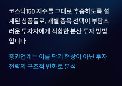 개별 종목 선택이 부담스러운 투자자라면, 코스닥150 ETF를 통해 분산 투자하는 방식도 하나의 선택지가 될 수 있다.