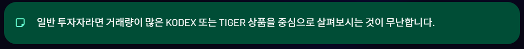 => 일반 투자자라면 거래량이 많은 KODEX 또는 TIGER 상품을 중심으로 살펴보시는 것이 무난합니다.