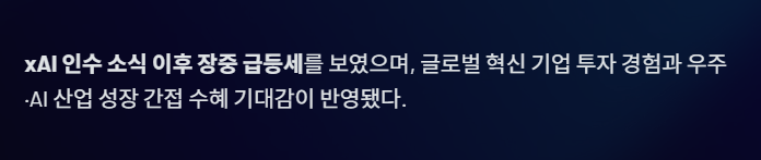 스페이스X의 xAI 인수 소식이 전해진 이후 관련 기대감이 커지며, 두 종목 모두 장중 큰 폭의 상승세를 보이기도 했다.