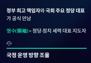 => 정부 최고 책임자(대통령 또는 국무총리)와 국회의 주요 정당 대표(영수)가 공식적으로 만나 국정 현안을 논의하는 회담을 말한다.