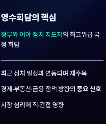 - 부동산, 세금, 금융 정책 논의 가능성이 함께 거론된다.