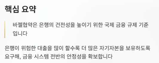바젤협약은 은행의 건전성을 높이기 위한 국제 금융 규제 기준이다. 은행이 위험한 대출을 많이 할수록 더 많은 자기자본을 보유하도록 요구해, 금융 시스템 전반의 안정성을 확보하는 것이 목적이다.
