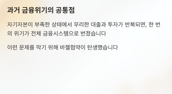 과거 금융위기의 공통점은 은행의 과도한 위험 추구였다. 자기자본이 충분하지 않은 상태에서 무리한 대출과 투자가 반복되면, 한 번의 위기가 전체 금융시스템으로 번진다.