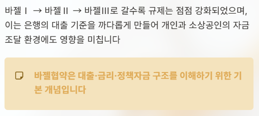 바젤협약은 단순한 금융 용어가 아니라, 대출·금리·정책자금 구조를 이해하기 위한 기본 개념으로 볼 수 있다.