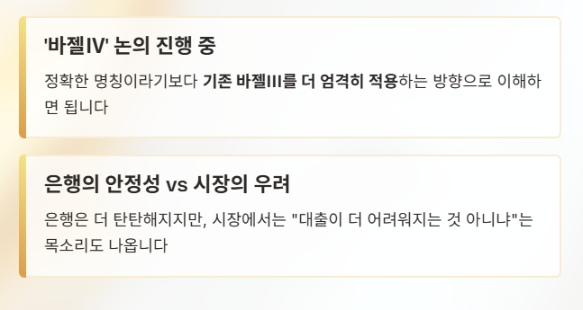 바젤협약은 금융 위기를 막는 안전장치인 동시에, 경기 회복 국면에서는 부담이 될 수도 있다. 결국 핵심은 금융 안정과 성장 사이의 균형이다.