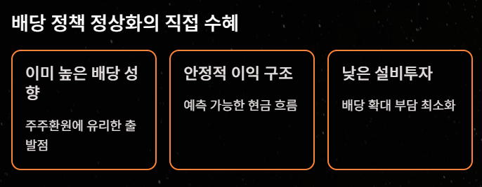 즉, 배당 확대나 자사주 정책 변화에 대한 부담이 적은 업종이라는 점에서 시장의 신뢰를 받는다.