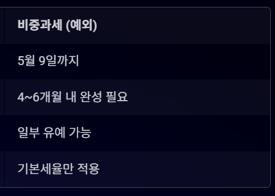 ➡︎ 2026년 5월 9일까지 거래 계약을 체결한 경우는 별도 요건을 충족하면 중과세를 피할 수 있도록 했다.