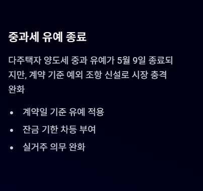 정부는 예정대로 5월 9일을 기점으로 다주택자에 대한 양도세 중과 유예를 종료하되, 시장 혼란 완화 및 세입자 보호를 위한 예외·보완 조치도 함께 발표했다.